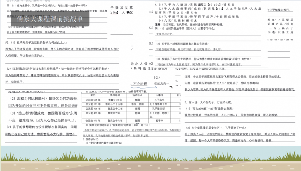 小学六年级,我们走进了高段的大课程——孔子世家。我们阅读《论语》选段原文,完成课前挑战单,在课堂上展开深入讨论,课后完成写作。即使在假期,我们也没有停下脚步——继续阅读与孔子世家相关的书籍,参与线上讨论,完成延伸写作任务。在这样持续而深入的学习与思考中,我们不再只是简单地“学习文本”,而是逐渐体会到儒家思想的智慧与精神。我们在学习中逐渐走近孔子,了解了他一生的发展脉络,感受到他一生对恢复礼乐,推行仁政的追求。