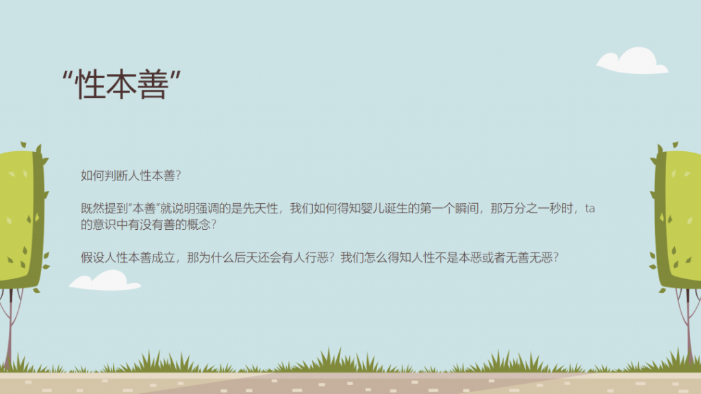 儒家课程中,给我印象最深刻的一个主张之一是“性本善”,大家试着先放下自己对这个话题初始的理解,抑或是成见。假设第一次听到性本善这个观点,我相信,不同的人对此观点会有各式各样的想法,如:如何判断人性本善?既然提到“本善”就说明强调的是先天性,我们如何得知婴儿诞生的第一个瞬间,那万分之一秒时,ta的意识中有没有善的概念?假设人性本善成立,那为什么后天还会有人行恶?我们怎么得知人性不是本恶或者无善无恶?在我们今日对“性善论”已有所理解的视野下,这些问题或许显得天真甚至幼稚。然而,正是这种未经雕琢的提问,正是思想最初的萌芽与碰撞。哲学的诞生并非始于结论,而是始于追问。