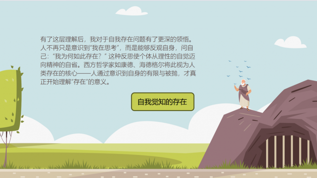 有了这层理解后,我对于自我存在问题有了更深的领悟。人不再只是意识到“我在思考”,而是能够反观自身,问自己:“我为何如此存在?” 这种反思使个体从理性的自觉迈向精神的自省。