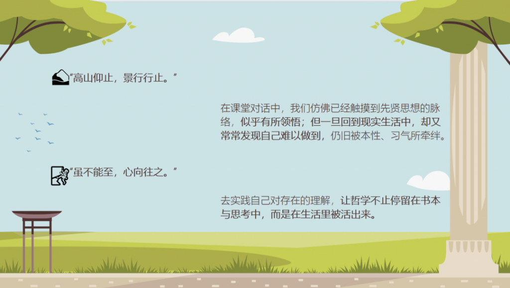 除了思想上的层层提升,我相信不止是我,许多人在逐渐走入儒家思想时都会产生一种共同的感受——高山仰止,景行行止。在课堂对话中,我们仿佛已经触摸到先贤思想的脉络,似乎有所领悟;但一旦回到现实生活中,却又常常发现自己难以做到,仍旧被本性、习气所牵绊。用王阳明“知行合一”的思想来讲,如果做不出来,那就还不是真知。这确实是一件不容易的事。孔子也曾说自己“不敢言道”。但是,“虽不能至,心向往之。” 这句话让我深受触动。虽然当下的我还无法完全抵达“道”的境界,依然会在行动中反复、在困惑中挣扎,但我始终在尝试——去实践自己对存在的理解,让哲学不止停留在书本与思考中,而是在生活里被活出来。