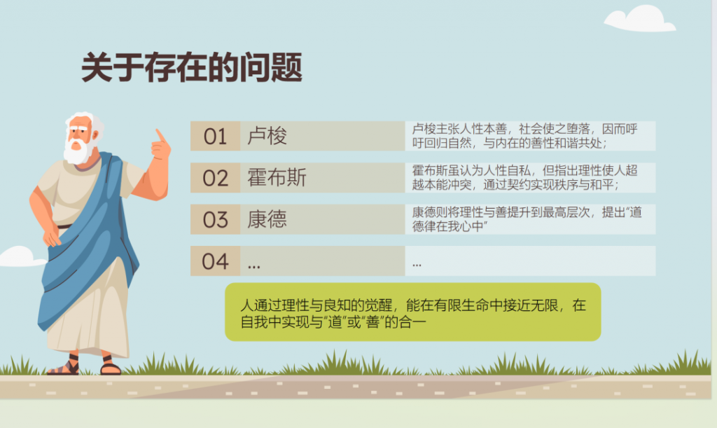 到了高中之后,除了进一步深化中哲学习,我们还在谌洪果老师的带领下,系统性的学习西哲。借助西哲,我对于存在问题有了更加深入的思考。卢梭、霍布斯与康德都从不同路径探讨了这种“超越与合一”的存在。
