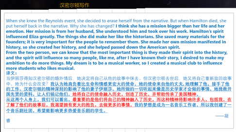 凝睿说: I think she has a mission bigger than her life and her emotion. Her mission is from her husband, She understood him and took over his work. Hamilton’s spirit influenced Eliza greatly. The things she did make her like the historians. She saved many materials for the founders; it is very important for the people to remember them. She made her own mission manifested in history, so she created her history, and she helped passed down the American spirit.