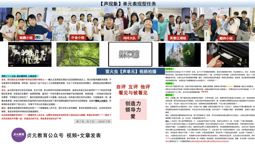 但只要作为教师从旁适时跟进,孩子们自身就会以团队自居,团队中率先的人就会成为领导者,以各自不同的方式凝聚着不同的能量场,同伴间的看见与被看见、理解与被理解就化为他们的爱与创造力。最后,孩子们将各个小组的点评与视频梳理成一篇长达8000多字的论文发表在学校公众号上,而这一切次的体验也令孩子们倍感兴奋,深觉自己“简直太厉害了”!