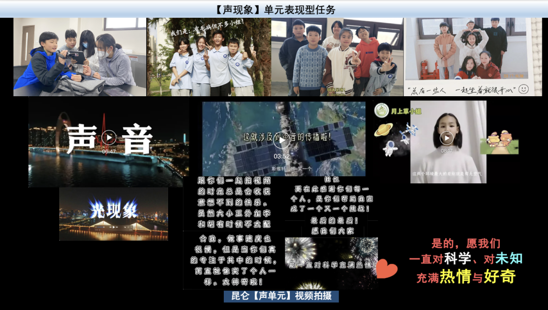 4)但,孩子们的潜力不止于此,六年级的孩子们生命正蓬勃且热烈,我们可以以一切能够想象到的方式去去及尽可能地激发他生命的热情与渴望,让他觉得“我能行、我可以”!所以,基于课程的扎实推进,此时可以代入更具挑战性的单元表现型任务——以小组为单位拍摄声音的科学小视频,呈现探索历程(可以以某一节为主题也可以以整个单元为主题)。