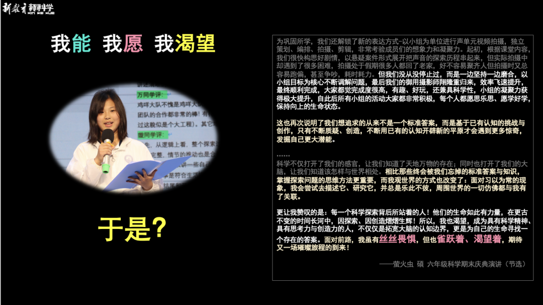 是的,当孩子有了这样系统的科学思维与能力积淀,便具备了与未知对话的渴望与热情,对于即将到来的中学阶段,不是茫然无措,而是怀着“我能,我愿,我渴望”的姿态,迎向每一个未知的挑战与可能。这正是科学所激荡出的生命最温柔而坚定的力量。