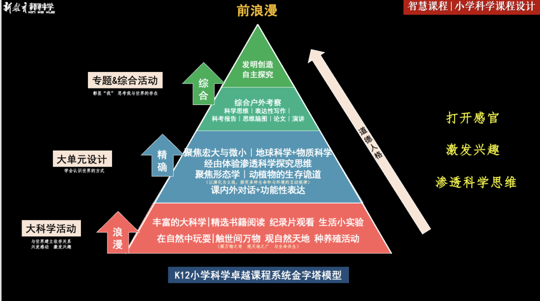 其中,对于具体课程设计是如何实施的呢?基于儿童生命发展的节奏:浪漫-精确-综合来实施。