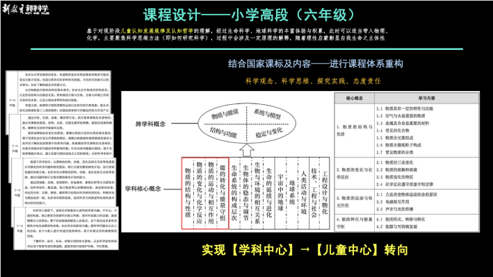 基于儿童认知发展规律及节奏,结合国家课标及内容——进行物质科学课程体系的重构,以实现从知识中心到儿童中心的转向。六上以“不可思议的物质循环“为主线,依次聚焦分子动理论、物态变化、化学之谜、生态循环,形成物质观,六下以“能量转换”为主线,依次走进声、光、电、磁,判天地之美,析万物之理,以此,科学理性之舟扬帆远航!