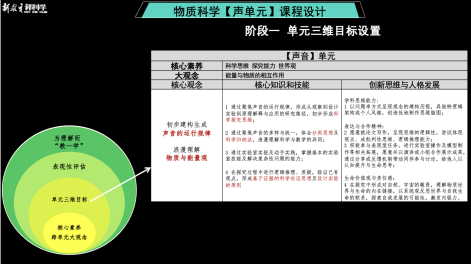 阶段一,要设定声单元的三维目标,包含核心观念、核心技能、创新思维与人格发展三项,其中核心观念就是初步建构生成声音的运行规律,浪漫理解物质与能量观;