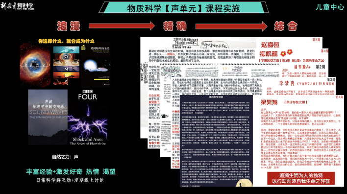 单元的浪漫阶段——在学期开始前的寒暑假就已经开始了,假期会推荐孩子们观看关于「声光电磁」的纪录片及相关书籍,以此丰富他的已有经验,并进而激发好奇、热情与渴望。如何激发?进行定期的线上讨论与互动,基于孩子们的习作梳理进行深度点评,去澄清内容、点燃渴望、唤醒孩子生命的内在能量。以此,他就会对接下来即将走进的科学之旅,充满兴趣与渴望。