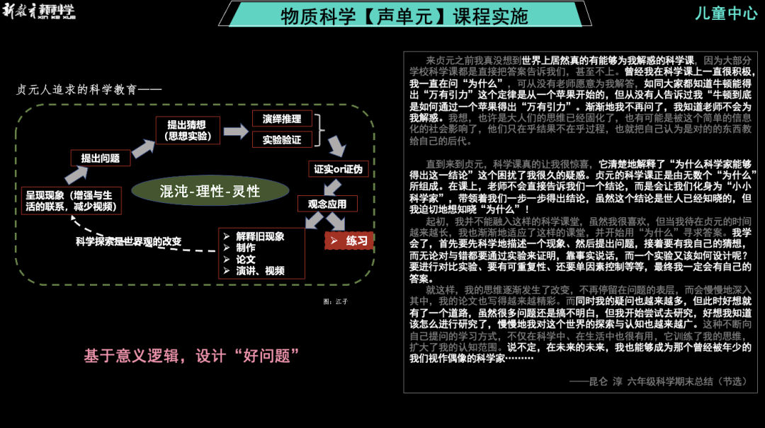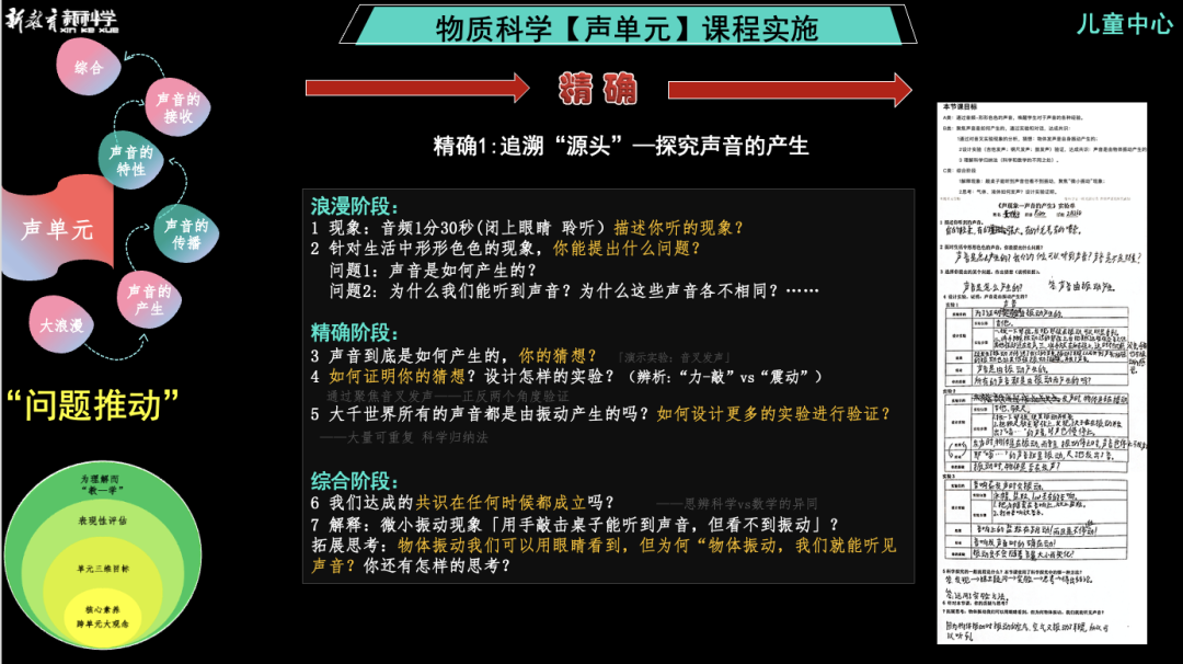精确1:声音的产生为例呈现一堂课的实施过程,一堂课仍然是浪漫精确综合的小循环,而整个历程都是以问题推动: