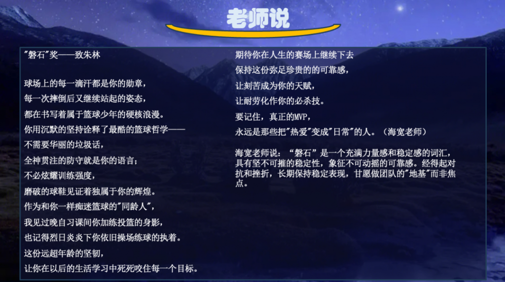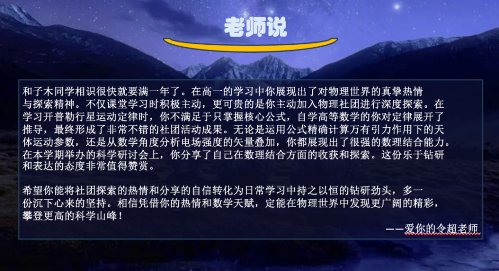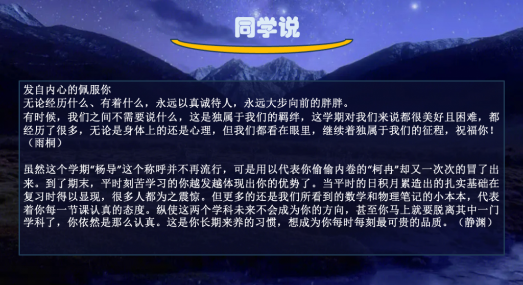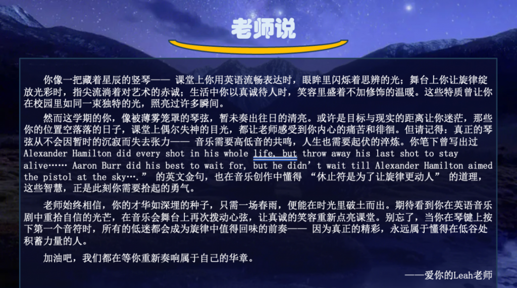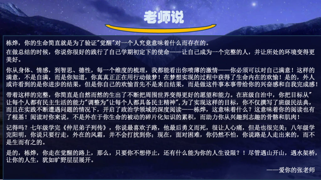 b:这也正是他的魅力所在呢!虽然幽默,但我们也看出来了这个学期他生命内在成长。