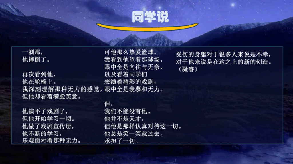 b:在开学,我们总是会嘲笑他的口语,但现在我们能看到,当我们深入了解这个生命,会发现他一直在思考,一直在进步。
