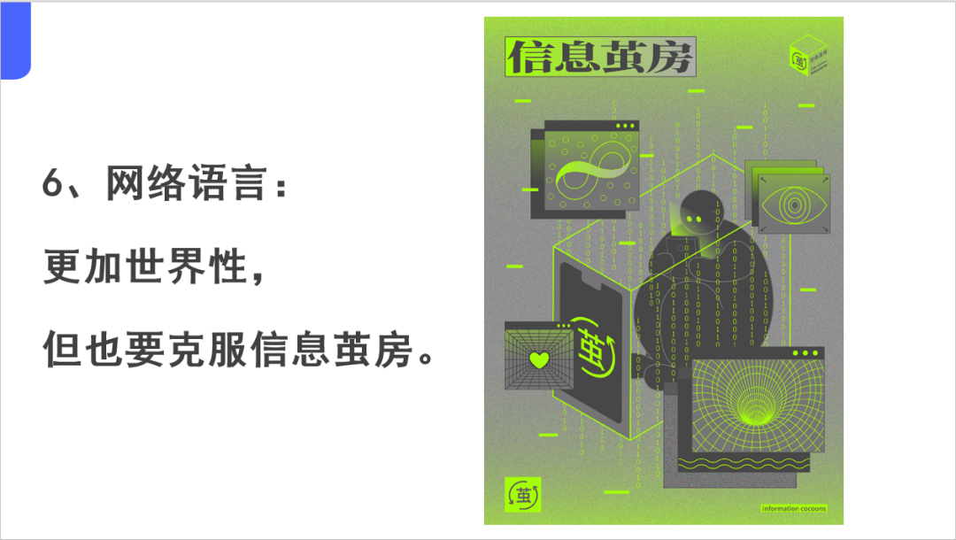 06 网络语言第六个,当然是我们所说的网络语言。自从互联网在中国兴盛以后,尤其是2001年,被称为互联网的公民权利元年,有很多的公共事件都是由互联网、由各种社区讨论,今天就更不可同日而语。网络语言,我们知道最大的一个特点,就是它的语言产生和消失的速度都非常大,而且是爆炸性的,借助网络语言这个世界,它更具有世界性。我是一直在观察它的发展——从言论自由的这个角度。我们当时是认为网络语言的开放,会导致我们有更大的对话交流,更加地言论自由,言论自由是为了达到什么目的?达到认识真理、达到形成共识。但是实际上,从今天的状况看来并非如此。因为在网络语言方面,借助现代的数据化、科技化的方式,更容易导致各种各样的所谓的“信息茧房”——每一个人在网络时代,你使用的语言有可能更加地偏狭,这种语言有可能更加地会固化你的思维,这是我们需要警惕的。再加上我们有很多的语言污染和扭曲。语言的技术也都在实施。就像我们今天刷抖音,刷什么样的消息,它都是根据数据喂你想要的东西,实际上是使人在寻找信息的过程当中,丧失了语言本来应该赋予人本身的一个自主性、一种主权。因为语言是代表了人对生命的主权的重要标志,但是今天,在这个网络时代,我们往往可能要面临这样危险。因此,网络语言它会导致一方面在开放,但是一方面是剧烈的语言的分化。这种分化是什么?如果你真正地投入到网络语言的洪流当中,去敏锐地去开发和应用你的语言,那么很显然,你的进步也是与日俱进的。但是如果你固守在以前的信息茧房当中,你跟另外一群人的差距会越来越大。这是今天的一个重要的问题。