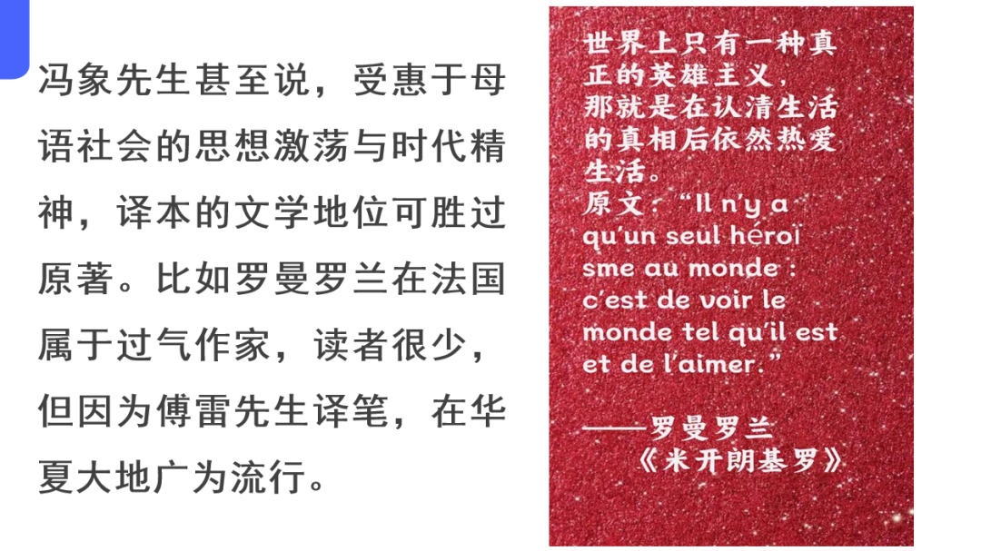 学习语言并不仅仅是传统的符合论、真理观的问题,是主观跟客观的符合,我们把第二语言作为一种对象去研究,然后去寻找它的规律、规则,然后化为语言,这个是很难达到的。所以,它其实是一种解释学的互动,是不断地在语言交流过程当中去调整我们的视野、去矫正我们的价值观。但是并不是说我们是一张白纸,我们在学习新的语言的时候,总是带有自身的各种生活经验和价值的烙印的,这是好事还是坏事?我想其实这是一件好的事情,尽管刚才张祎凡也在他的演讲当中一直在讲,他希望用地道的英语,像母语一般地去思考,但是呢,作为一个第二语言的人,去学习另外一个语言,我想他其实也是有独特的比较优势的。冯象先生(中国现当代著名哲学家与哲学史家冯契的儿子)是清华大学的教授,也是哈佛大学和耶鲁大学的双料博士,他的中英文的水平都非常地高,他曾经说过,“受惠于母语社会思想激荡与时代精神,译本的文学地位甚至可以胜过原著。”他说,比如罗曼罗兰,在法国属于过气的作家,读者很少,但是因为傅雷先生的译笔,在华夏大地广为流行。比如他的《约翰克里斯朵夫》包括《飘》等等这些著作,可能不是一流的著作,但是翻译成中文以后,风靡了一代又一代的人。