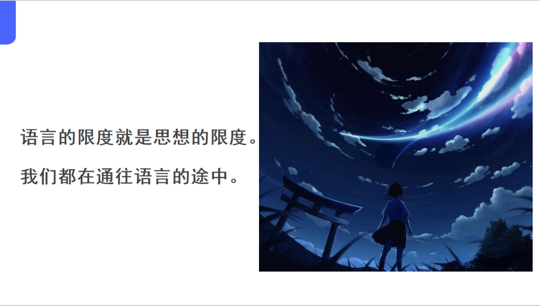 重新解释“语言是存在的家园”所以,最后给大家分享一下,我们刚才已经通过人工智能时代,我们为什么要强化学习第二外语,语言不仅是一种工具,说到底它就是存在的家,这当然是海德格尔的一个标签式的话,我们给它注入新的理解。海德格尔说这句话并不是创新的说法,亚里士多德早就说过他说,“人是语言的存在者”,或者是人是“逻各斯”的动物。在那个时代,“逻各斯”就是指语言,因为人离开了语言就缺乏了“逻各斯”,就缺乏了参与公共政治生活的公共性,然后就丧失了自己的自由。因为,在古希腊,你的自由是体现在你的行动当中的。所以说,我们知道伯里克利,他在《伯罗奔尼撒战争史》里面的葬礼前的演讲,曾经说过,有自由才有幸福,但是有勇敢才有自由,这意味着什么?自由是要投入你的行动——公共行动的。语言本身就是最大的一个公共行动,所以我们会发现,比如说美国,你们看他们各种层级各种级别整天在演讲,从小到大,他的人文通识教育、公共教育,就在训练怎么去公共演说、怎么去表达自己的。所以这样的一种公共语言的塑造,它是不断地形成了一种共同的文化,所以后来维特根斯坦才说,没有所谓的私人语言。哪有什么纯粹的自说自话的语言?私人语言就不叫语言,所以你离开语言,你是不能够真正地表达思想的。人就是语言的存在,通过语言我们认识到了真理,我们也认识到了我们自己。但是这个真理不是固化的真理,在海德格尔的视野里面,如果把真理跟语言联系起来,他说真理是什么?语言是存在本身的既澄明又遮蔽的到达,也就是说,我们平时都认为语言可能既是显明真理,但有可能会遮蔽我们的真理,所以我们需要切换不同的视角,需要不断地有第二种语言、第三种语言去唤醒我们。但是真正的真理既是遮蔽的又是澄明的,就是所谓的“林中路”。语言是或隐或显的一种显现的一种操作,是一种操作手法,说明真理它本身并不是固化的,它就是在有限性当中去呼唤,不断地自我突破,然后让真理或者精神本身不断地向人显现的过程。我们这几天听孩子们演唱各种英文歌剧,我们感受到的是什么?生命的跃动!在生命的跃动背后感感受到的是什么?精神的召唤、精神的力量!这就是真理在生命里面显现的过程。所以,语言的限度就是思想的限度,我们都在通往语言的途中。我们在通往真理的途中,我不可想象有真正的脱离语言的思想,那是一种幻象。