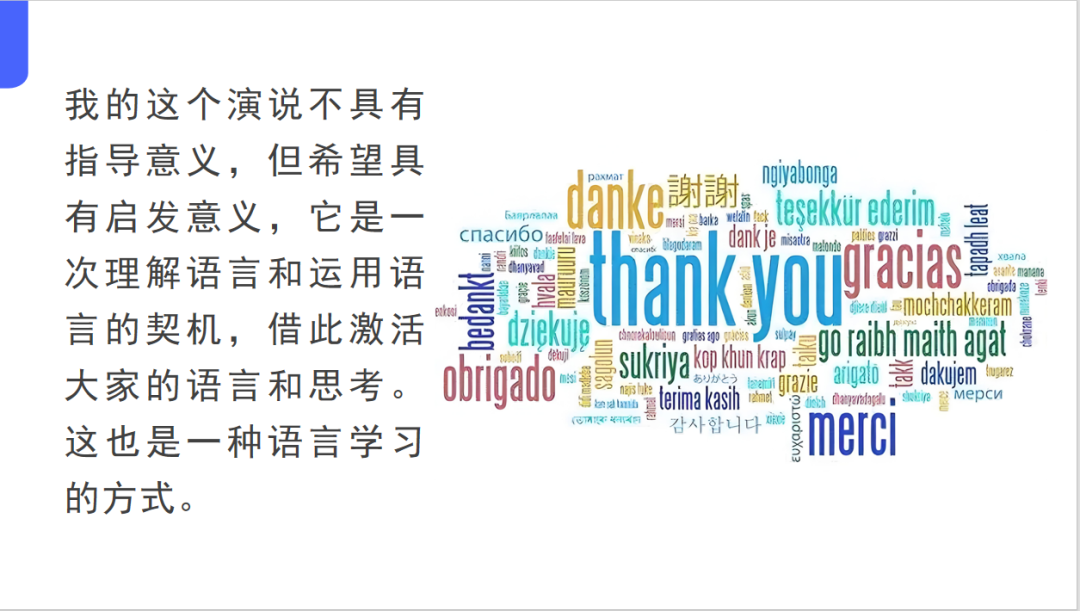 我这个演说,严格来说它并不具有所谓的指导意义。因为我想,我们从这两天沉浸式、轰炸式的英语氛围当中,每一个人都受到了很好的指导。但是我希望,我今天的分享是有一定的启发意义的,也可以把我这个分享,作为一个土生土长的中国人——我连普通话都说不标准,我是四川人,所以我的普通话叫“川普”,所以我的英语也是“川普”——我希望我也是一个语言实验,借助我自己的视角,尤其我学习英语失败的经历,给大家提供一个理解语言和应用语言的契机,借此激活我们大家对于语言的思考,这也是我的一个独特的语言学习方式。
