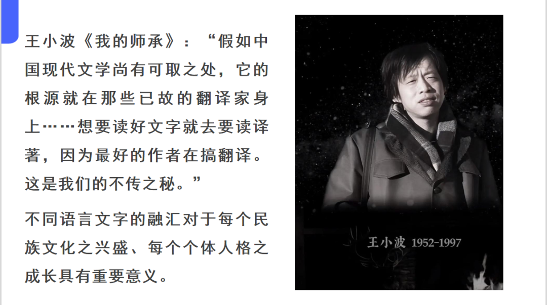 关于英语的语言学习有很多种,这几天大家感触颇深的就是“音乐剧”的学习方式,我想从另外一种英语学习的方式开始(引入):翻译。因为我自己也曾经翻译出版过几本书。我想从中国当代作家王小波的一句话说起,王小波在他的杂文集《沉默的大多数》的第一篇文章里面曾经说了下面这段话,在这段话里面他回顾了他自己受到的,比如查良铮、王道乾这些中国伟大的翻译家的影响,他说他的写作和他对语言的节奏和敏感的感受,都极大地受惠于这些翻译的大家。在这个文章的最后,王小波说了这么两句话:“假如中国现代文学尚有可取之处,那它的根源就在那些已故的翻译家身上。想要读好的文字,就要去读译著,因为最好的作者在搞翻译,这是我们的不传之秘。”