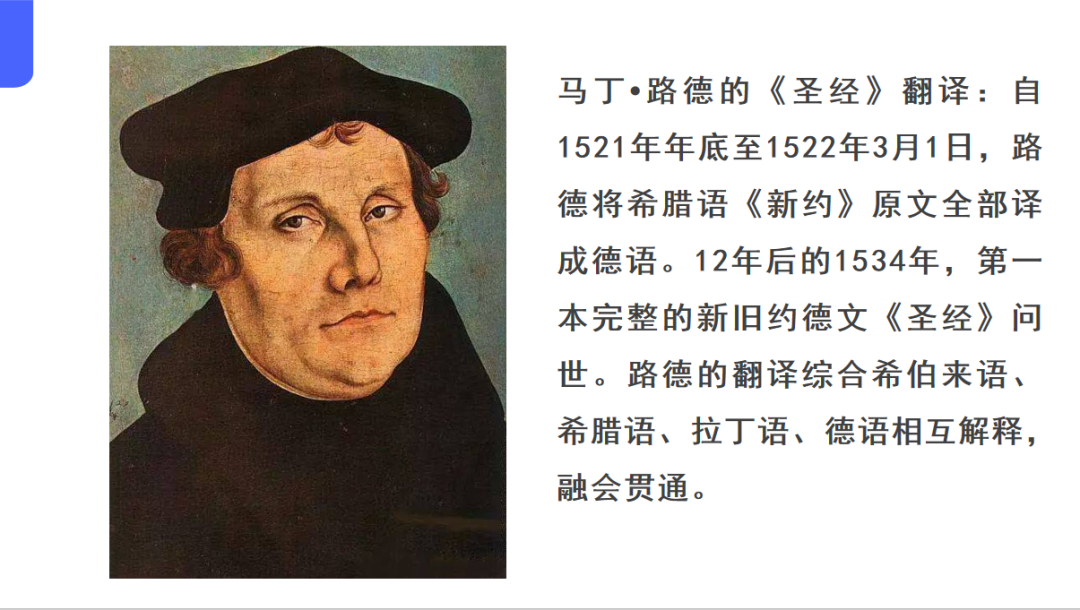 德国的翻译运动我想先回顾一下一些大的翻译运动,比如说德语,我们知道德国这个国家,在欧洲的中腹,它相对于周围的这些民族,是一个很落后的、很下里巴人的一个民族,相当于是一个日耳曼的、野蛮的民族。也就说,这个民族的语言的成熟和发展,真正形成我们今天所能看到的,伟大的哲学和文学方面的德语式的表达,实际上并不是年代太久的事情。真正奠定德语民族语言和文学基础的,其实是来自于一个著名的宗教改革家,也是伟大的神学思想家马丁路德。马丁路德在1517年推动宗教改革以后,在1521—1522年,他就开始意识到,语言文字对于民族心灵的塑造作用。所以,他在10个月的时间内,先把300多页的希腊语的《新约》全文全部译成了德语,12年后的1534年,他又把《旧约》也翻译完成了,一本完整的新旧约的德文《圣经》版本问世。路德在翻译《圣经》的过程当中,综合了西伯来语、希腊语、拉丁语以及本土不同地方的德语方言,进行了综合地塑造,相互解释、融会贯通,形成了我们今天熟知的德语。