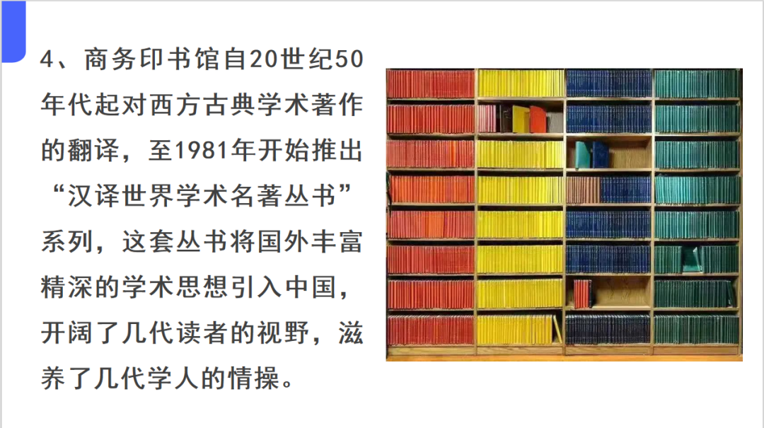 04 商务印书馆对西方古典学术著作的翻译我再说一两个,49年以后我们的大型翻译运动。其实我们49年以后,大量翻译的丛书系列非常多,有两个是具有代表性的,这两个大型翻译运动对于现代汉语塑造,尤其我们今天都在使用的汉语也是打下了深深的烙印。第一个是商务印书馆。商务印书馆自20世纪50年代以来就开始了对西方学术经典著作的翻译,到了1981年,开始推出了所谓的彩虹书,而且是几种颜色的版本,非常得经典,好多人包括在“知无知”,我们基本都收齐了商务印书馆各种版本的著作——“汉译世界学术名著丛书”,哲学的、经济学的、历史学的、政治学的各种社科方面的书都具备。哲学基本是棕红色的,历史学是蓝色的,经济学是另外一种颜色……这套丛书,可以说是影响了几代人,尤其是80年代以来的两三代的中国学术中坚力量。也就是说,这些学术思想引入中国,开阔了几代读者的视野,滋养了几代学生的情操,这是商务印书馆。