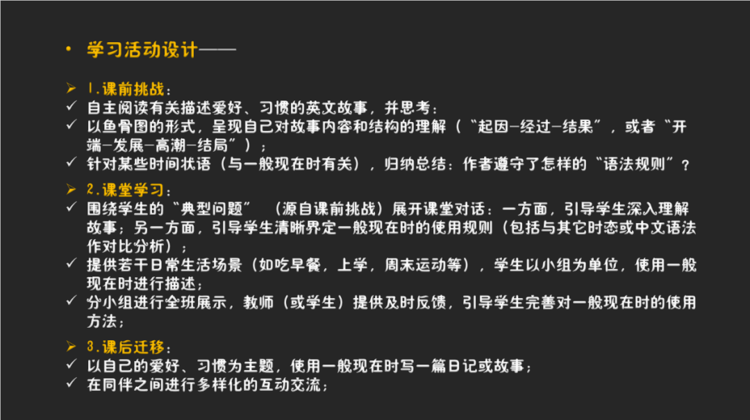 目标确定后,就是设计一节课的学习活动了。这个环节又分“课前挑战”“课堂学习”“课后迁移”三个板块—— 目标确定后,就是设计一节课的学习活动了。这个环节又分“课前挑战”“课堂学习”“课后迁移”三个板块——