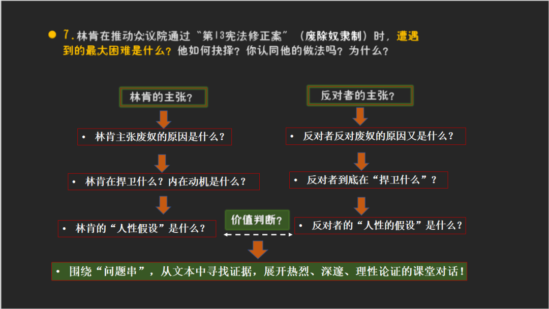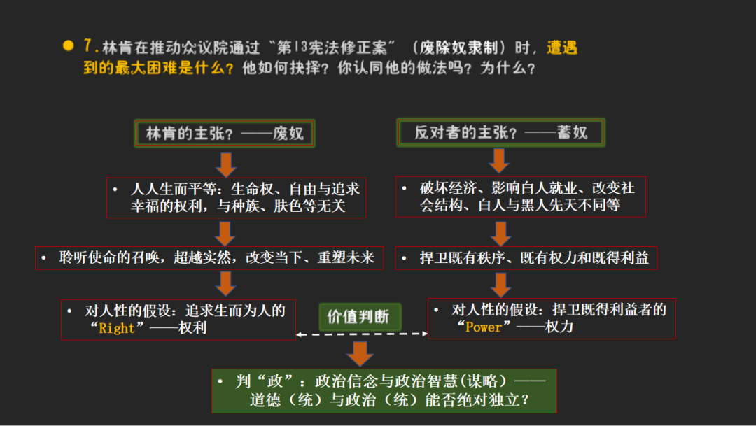 至此,学生对林肯所遭遇的矛盾与冲突有了清晰地把握,并因此可以更好地把握政治信念与政治智慧之间的关系:丧失基于价值判断的政治信念,所谓政治智慧有可能堕落为“不择手段”,这说明政治(统)并不能完全无视道德(统)之存在。在此基础上,学生会进一步展开对话:林肯是如何抉择的?你认同他的做法吗?为什么? 至此,学生对林肯所遭遇的矛盾与冲突有了清晰地把握,并因此可以更好地把握政治信念与政治智慧之间的关系:丧失基于价值判断的政治信念,所谓政治智慧有可能堕落为“不择手段”,这说明政治(统)并不能完全无视道德(统)之存在。在此基础上,学生会进一步展开对话:林肯是如何抉择的?你认同他的做法吗?为什么? 至此,学生对林肯所遭遇的矛盾与冲突有了清晰地把握,并因此可以更好地把握政治信念与政治智慧之间的关系:丧失基于价值判断的政治信念,所谓政治智慧有可能堕落为“不择手段”,这说明政治(统)并不能完全无视道德(统)之存在。在此基础上,学生会进一步展开对话:林肯是如何抉择的?你认同他的做法吗?为什么?