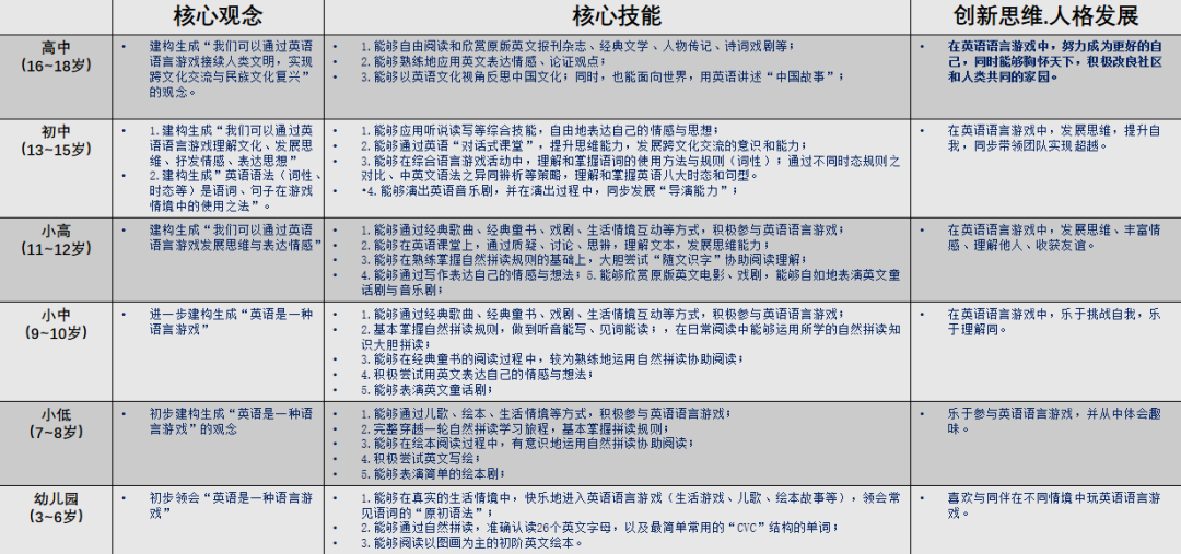 这是一个系统思考的问题。我们必须首先对k-12终点展望:12年级的贞元毕业生,英文可以抵达怎样的水平?然后明白,起点处,也就是3-6岁的幼儿,英文可以抵达怎样的水平?如此立足起点,展望终点,思考,如何从3-6岁的水平抵达我们期待的12年级的水平。基于此,我们制定了六学段学生发展的三维目标。 这是一个系统思考的问题。我们必须首先对k-12 终点展望:12年级的贞元毕业生,英文可以抵达怎样的水平?然后明白,起点处,也就是3-6岁的幼儿,英文可以抵达怎样的水平?如此立足起点,展望终点,思考,如何从3-6岁的水平抵达我们期待的12年级的水平。基于此,我们制定了六学段学生发展的三维目标。 终点展望:12年级的贞元毕业生,英文可以抵达怎样的水平?然后明白,起点处,也就是3-6岁的幼儿,英文可以抵达怎样的水平?如此立足起点,展望终点,思考,如何从3-6岁的水平抵达我们期待的12年级的水平。基于此,我们制定了六学段学生发展的三维目标。