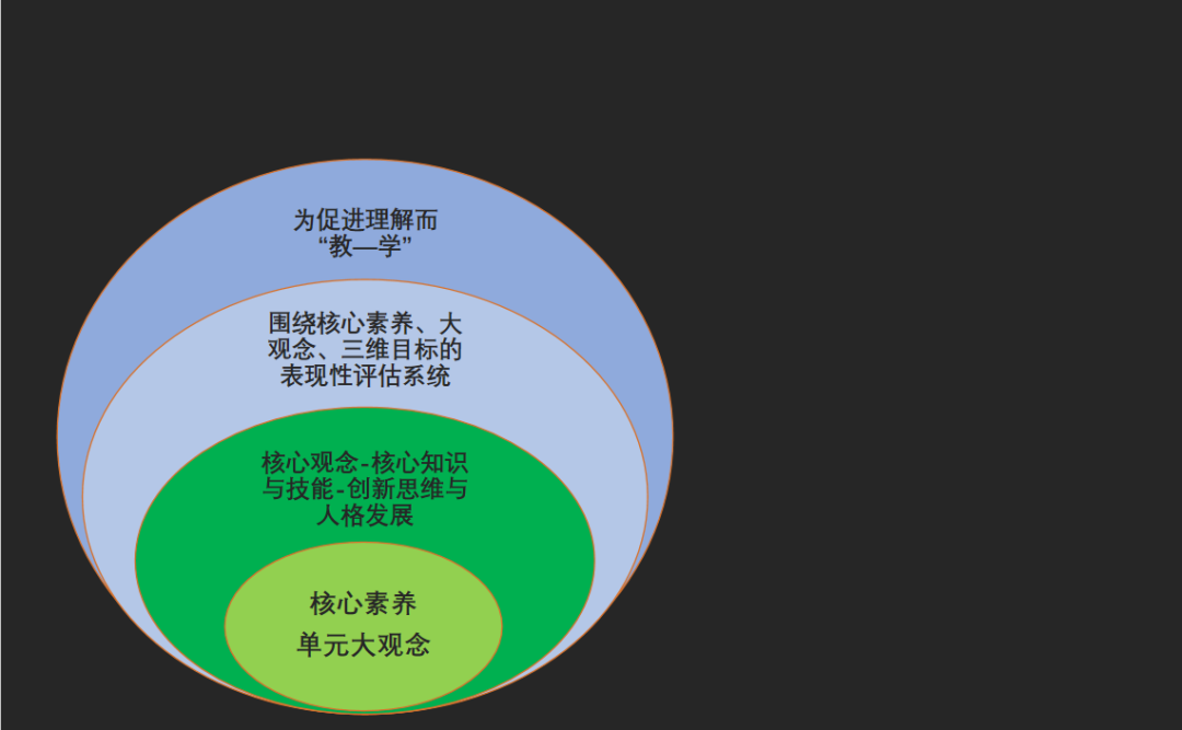 最内层(浅绿色)的椭圆聚焦本单元涉及到的学科核心素养和大观念;然后围绕已经确定的大观念确定本单元的“三维目标”,即:核心观念、核心知识与技能、创新思维与人格发展;随后再围绕本单元的大观念和三维目标制定“表现性评估系统”,主要包括前测-章前评估、中测-章中评估与后测-章末评估。 最内层(浅绿色)的椭圆聚焦本单元涉及到的学科核心素养和大观念;然后围绕已经确定的大观念确定本单元的“三维目标”,即:核心观念、核心知识与技能、创新思维与人格发展;随后再围绕本单元的大观念和三维目标制定“表现性评估系统”,主要包括前测-章前评估、中测-章中评估与后测-章末评估。