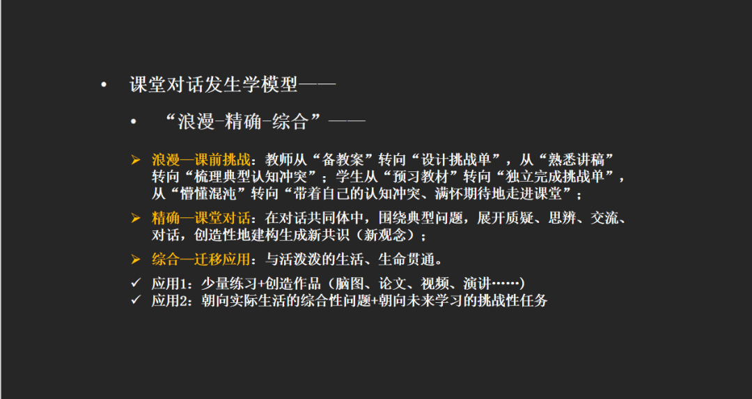 课堂对话的关键是:在对话共同体中,典型问题推动下的操作、实验、思辨、交流、对话、建构共识(新观念)。课后应用的关键是:迁移应用新观念,与生活、生命贯通。应用类型一:少量练习+创造作品(脑图、论文、视频、演讲等;应用类型二:朝向实际问题的综合性挑战+朝向未来学习的挑战性任务。 课堂对话的关键是:在对话共同体中,典型问题推动下的操作、实验、思辨、交流、对话、建构共识(新观念)。课后应用的关键是:迁移应用新观念,与生活、生命贯通。应用类型一:少量练习+创造作品(脑图、论文、视频、演讲等;应用类型二:朝向实际问题的综合性挑战+朝向未来学习的挑战性任务。 课堂对话的关键是:在对话共同体中,典型问题推动下的操作、实验、思辨、交流、对话、建构共识(新观念)。课后应用的关键是:迁移应用新观念,与生活、生命贯通。应用类型一:少量练习+创造作品(脑图、论文、视频、演讲等;应用类型二:朝向实际问题的综合性挑战+朝向未来学习的挑战性任务。
