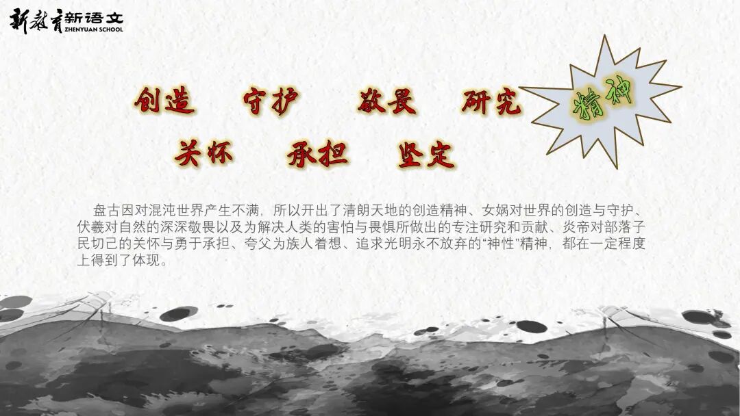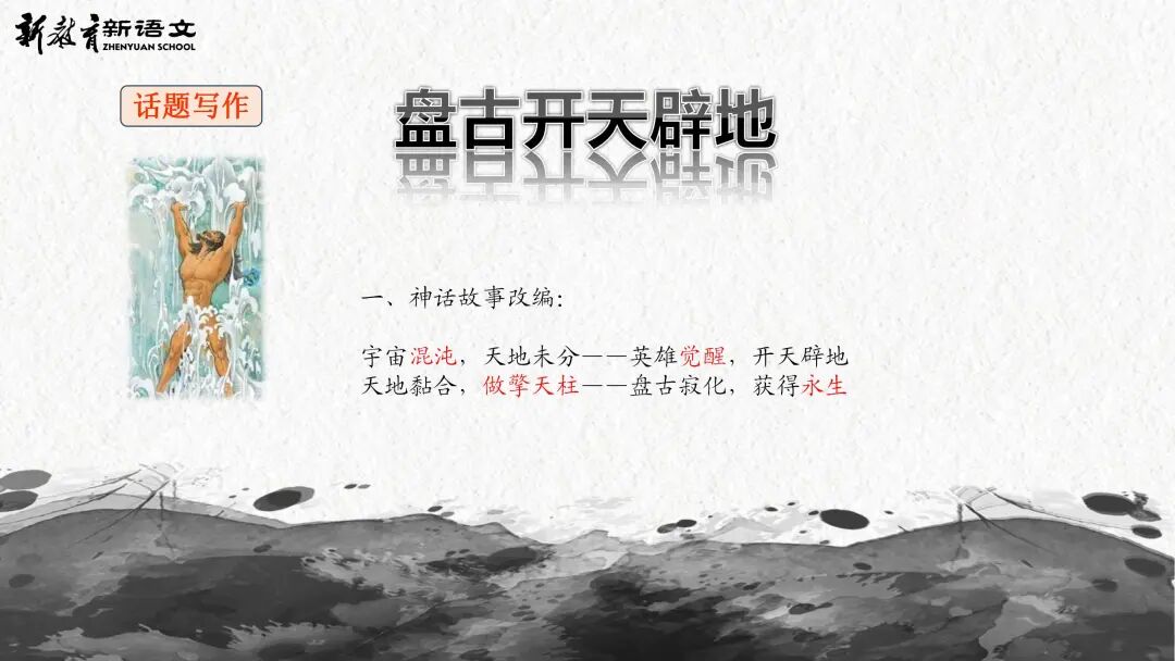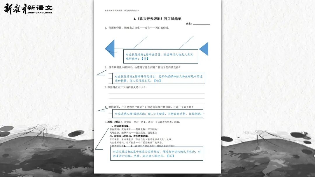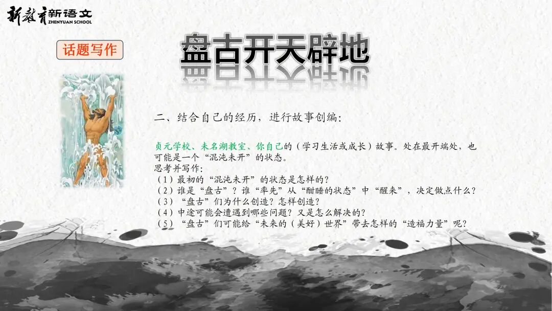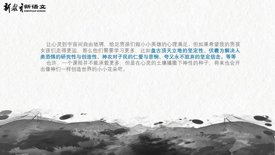 以《盘古开天地》为例,我希望帮助孩子理解先人对“世界从何而来的”浪漫想象,初步建构盘古之为创世神的“创造”观念,同时为单元整体学完并理解“英雄的旅程”做好铺垫,以实现“神话人物——作为……创造性意义的神圣意象的象征……指导儿童的心灵不断自我更新、自我超越“的精神发展的可能性。