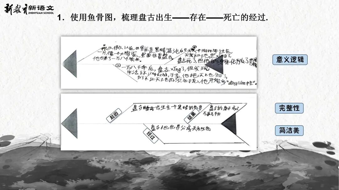 【讲述】这是第一题。我选用了两个孩子的答案。第二份看似更简炼,它体现出鱼骨图梳理的“完整性”和“简洁美”;第二份预习单则把教研达成的共识体现出来了——“梳理故事的起因、经过、结果”时要讲究“意义逻辑”——你看,他把“黑暗混沌里的沉睡”作为盘古“分开天地”的原因;其次,开天辟地、当“顶梁柱”作为事件的主要经过;最后,盘古死去、身体化为万物作为结果。