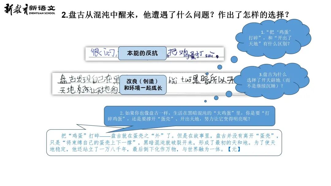 元同学说:把“鸡蛋”打碎——盘古就在蛋壳之“外”了。但是在故事里,盘古并没有离开“蛋壳”,只是“将束缚自己的蛋壳上下一撑”,黑暗混沌就破裂开来,形成了最初的天和地。为了使天地稳定,他还站立了一万八千年,最后倒下化作万物,与世界融为一体。