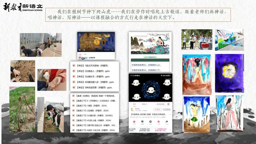 我们在植树节种下爬山虎,我们在劳作时唱起上古歌谣,跟着老师们画神话、唱神话、写神话——以课程融合的方式行走在神话的天空下。