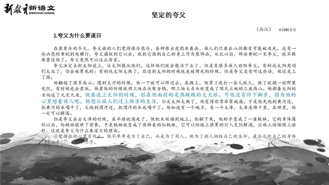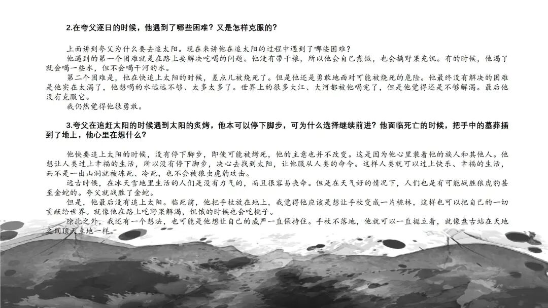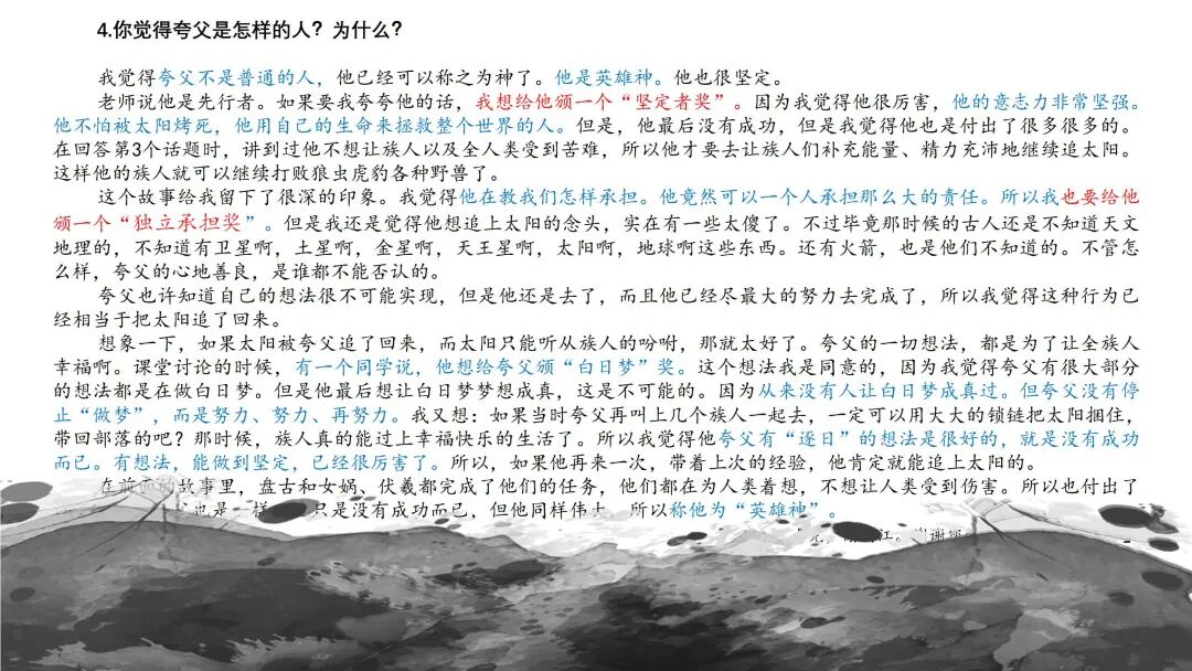 课堂讨论时,有同学说想给夸父颁“白日梦”奖……从来没有人让白日梦成真过。但夸父没有停止“做梦”,而是努力、努力、再努力……有“逐日”的想法是很好的,虽然没有成功。夸父有想法,并能做到坚定,已经很厉害了。