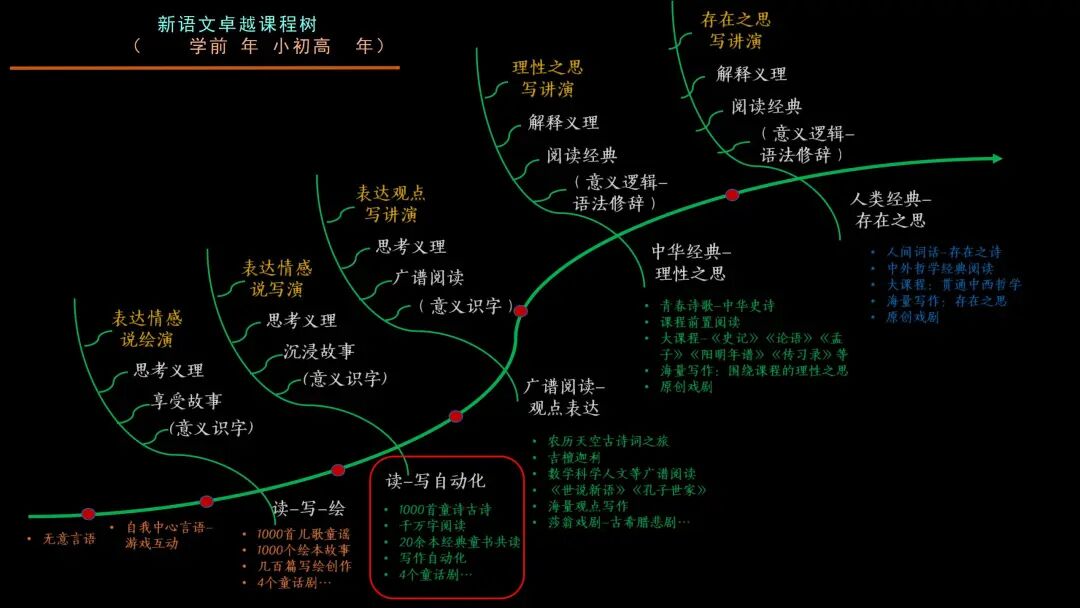 江子校长制作的K12新语文卓越课程树和课程系统金字塔模型,为我们指明了不同年龄阶段的孩童应当接受的课程方向和道路。神话课程,属于中段“读写自动化”项目中的“经典童书共读”,在小学课程金字塔 和 中段读写课程金字塔模型中 分别对应精确阶段和综合阶段的学习,为实现 儿童读写自动化 和道德人格向上发展,提供了非常好的精神养料。