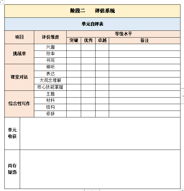 在确定本单元的三维目标后,便是本单元评估系统的拟定。在我们的评估系统里,有教师评、生生互评,但更侧重孩子们的自评。我们整个课程的价值取向,是偏儒家的,而在儒家的系统里,是非常关注自省的,“见贤思齐焉,见不贤而内自省也”“吾日三省吾身”,同时,我们的暮省课程也是道德人格课程的核心,“入暮思省,有无独创”,所以,在课程穿越的全程,关注自评也就成了我们课程的题中之义。未经省察的人生不值一过,未经自我省察的课程,又何尝不是如此呢?本单元挑战单的自评,我们让孩子们从“兴趣”“效率”“书写”三个维度来自评,因为“兴趣”是孩子们穿越课程内动力的不竭源泉。挑战单,是孩子们独立穿越的旅程,孩子们要自己去竭力与课文建立联系,如果在完成挑战单的过程中,许多孩子都兴趣缺失的话,往往意味着我们挑战单设计的失败,那我们课堂之上,便要及时进行调整,同时,也要对接下来的挑战单进行变动,以期可以更好地提升孩子们的兴趣,调动孩子们思维的活跃度。因为挑战单是孩子们的自行穿越,自行抵达自身思维的最高点,所以“效率”便很重要,一般情况下,一课时的挑战单孩子们要在二十分钟之内完成,用时过短往往意味着思维的参与不足,而用时过长则往往意味着思维的浪费,在空费力气徒劳无功。至于书写,则是基础要求,无需多言。课堂对话则从“倾听”“表达”“大观念理解”“核心技能掌握”等四个方面进行自评。课堂是一个场域,是一个故事,是师生围绕大观念共同穿越的旅程。在这趟旅程中,最重要的通行工具就是“对话”,“倾听”与“表达”则是“对话”不同侧面的呈现。倾听,听对方的观点,与自己脑海中的观念进行碰撞,表达,表达自己的理解,经由认同、补充、反对等,实现观念的丰富与深化。课时终了,反思自己这一堂课的旅程,大观念是否有所领会,核心技能是否更为娴熟,这也是课程的应有之义。无论如何,这趟课程穿越之旅,汗水与泪水、忧伤与兴奋,都应该被关注到,被思考到,进而为接下来的课程之旅积蓄能量,为生命的新发展提供动力。至于本单元穿越最后的那部分表现性评估,则以文字版访谈录的方式呈现,评估孩子们写作的指标,主要聚焦“主题”“材料”“结构”“修辞”等四个方面,尤以“主题”为重。这个表现性评估,主要呈现孩子们对于“人性是有光辉的”这一大观念的领会程度,孩子们领会得越为深入,访谈呈现出来的深度便越为深邃,对人性是有光辉的这一大观念的呈现便越为充分。至于结构,主要是让孩子们思考自己的表达是否有条理,访谈内容是否前后相属,贯通一气。材料主要让孩子们思考访谈的关键节点的选取是否恰切。修辞则让孩子们思考自己写作的语言运用,简明连贯得体,准确鲜明生动。最后,还会让孩子们写写自己这趟课程穿越之旅的收获与尚存疑惑。收获好理解,某种角度讲,就是让生命成长被看见,被自己看见,自己感受到自身的变化是成长的最佳动力。至于尚存疑惑,如果是当下可以说清楚的,则会跟孩子们一起去讨论澄清,如果是当下说不清楚的,则让孩子们带着疑惑继续前行,交给未来,交给生命,在时光深处,去寻求答案,毕竟,总有些路要孩子们一个人去走,总有些山要孩子们一个人去爬,尤其是一些关于单元核心大观念的问题,很多时候,需要孩子们用一生去寻求答案。