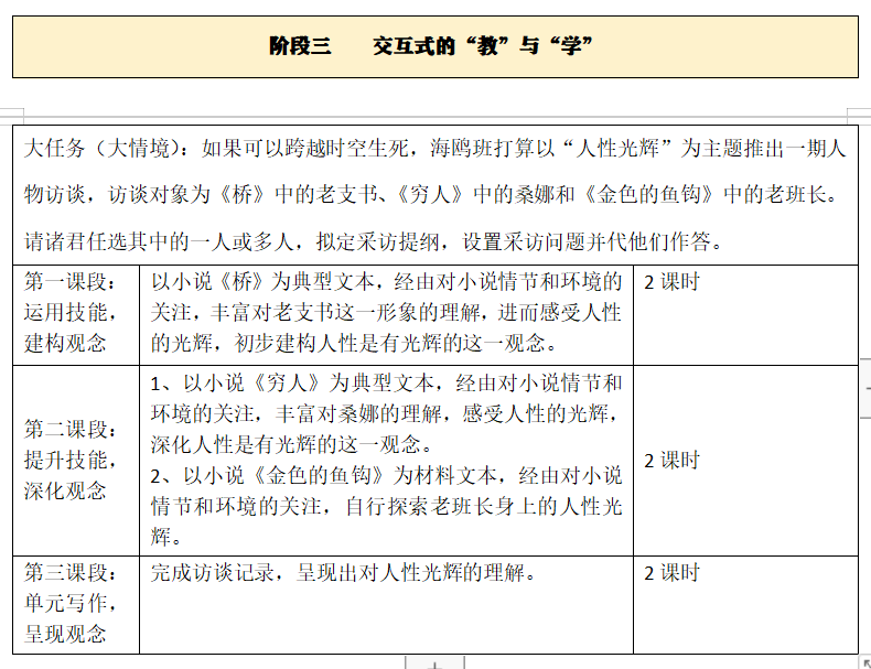 最后,便是落实为了理解而进行的“教与学”设计过程,进行具体的“大任务”“大项目”“大问题”或“大观念”等为统摄中心的大单元课时段安排。这个单元,我设计的终极表现性评估的大任务为“如果可以跨越时空生死,海鸥班打算以‘人性光辉’为主题推出一期人物访谈,访谈对象为《桥》中的老支书、《穷人》中的桑娜和《金色的鱼钩》中的老班长,请诸君任选其中的一人或多人,拟定采访提纲,设置采访问题并代他们作答”。基于如上的单元终极表现性评估的大任务,我进行了课时段的安排,第一课段“运用技能,建构观念”,以《桥》为例,跟孩子们一起穿越课文,建构“人性是有光辉的”这一单元核心观念。第二课段,“提升技能,深化观念”,仍旧立足于语言文字,穿越《金色的鱼钩》和《穷人》深化孩子们对于“人性是有光辉的”这一单元核心观念的理解。第三课段,便是单元写作,完成单元终极表现性评估的大任务,孩子们以完成“访谈录”的方式呈现自身对单元核心观念的理解水平。完成了单元终极表现性评估的设计和课时段的安排之后,便在前测了解孩子们单元核心观念的认知水平及核心知识与技能的掌握水平基础上,围绕三维目标,设计具体的每课时的挑战单。