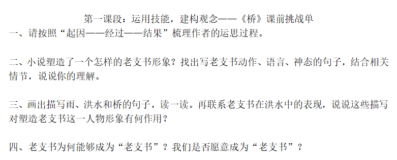 《桥》的课前挑战单,第一个问题,梳理作者的运思过程,就是孩子们披文入情的过程,在读课文的过程中,入课文共情,出课文审视,尝试与作者“视域融合”,感受作者的深情,体悟其所塑造人物的崇高。第二个问题,聚焦《桥》塑造的核心人物“老支书”,经由对核心知识与技能的运用,建构起一个有着人性光辉的生动形象。第三个问题,借由核心知识与技能,更深入地领会人性是有光辉的这一核心观念。第四个问题,当我们入乎“老支书”的精神世界后,还要出乎其外,关注我们自身的精神世界,我们自身是否愿意成为“老支书”,就是我们自身是否想要成就某种崇高。这个问题,没有标准答案,重要的是孩子们去思考,生命,到底需要如何去抉择,到底哪种抉择是我们生命源初的渴望。孩子们于此有思考,已是善莫大焉。