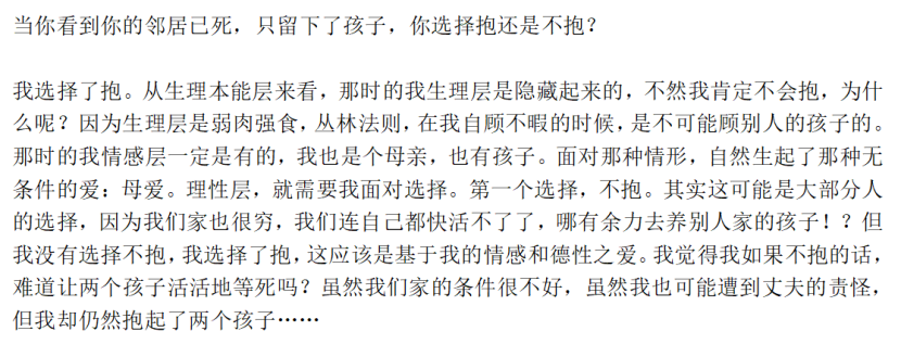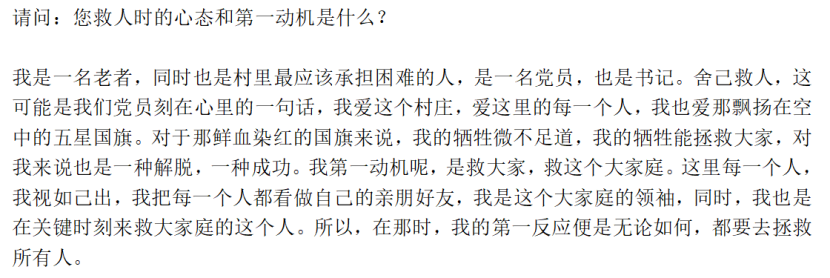 王志江校长制图比如“木桥前,没腿深的水里,站着他们的党支部书记,那个全村人都拥戴的老汉”,“站着”,是动作,更是神态,是主心骨,是脊梁,是洪水滔天中的“定海神针”。我让孩子们结合道德图谱,思考老支书为何会站在这里,站在这木桥前?当有了道德图谱这个思维工具,孩子们便发现这个危急关头站在桥前的老支书,情感满溢,对村民,满满的爱,这情感,已经是舍己为人,是道德的光辉。老支书不自己逃命而是预料到了村民的惶恐,先村民一步在桥前等待,危急时刻,稳定人心,抓住关键,充满决断力,极富责任感。此时的老支书,他的光辉,就在于情感层逆逃跑本能,充满判断力,身肩使命,舍己为人。唯有如此,老支书方成其大。比如“老汉突然冲上前,从队伍里揪出一个小伙子,吼道:‘你还算是个党员吗?排到后面去!’老汉凶得像只豹子”,是动作,是语言,是神态,更是一个老党员的拳拳之心。结合道德图谱,我跟孩子们一起讨论:从不同的层面,此时,老支书分别都做出了哪些抉择?讨论,对话,澄清:本能层,舍繁衍本能而将儿子“揪出”;情感层,舍父子情深而铁面无私;理性层,灭混乱之火苗而护秩序之长堤;德性层,以身作则,舍家为村。反本能已是伟大,为他人更显崇高,以道德图谱为工具,我跟孩子们深入老支书的精神世界,尝试从他的动作、语言、神态中读出他的生命密码,寻到人性的光辉。这个过程,也是这光辉照进孩子们心灵的过程,也是孩子们审视自我的过程。就这样讨论,交流,“人性是有光辉的”这个单元大观念经由核心技能得以初步建构,之后,便是核心技能的提升,单元大观念的深化。就这样一课时一课时穿越而过,在这个大单元的终点处,孩子们写下了如下的文字:
