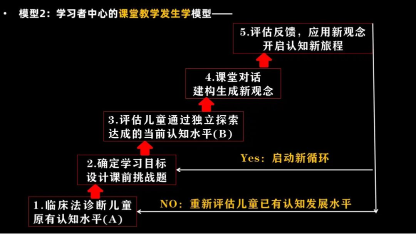 王志江校长制图在这个模型里,首先要追问的,便是这个单元的核心素养或者它的单元大观念到底为何?核心素养或者单元大观念,就是我们所追求的万变不离其宗的“宗”,以一驭万的“一”。在这个基础上,我们确定这个大单元的三维目标:核心观念、核心知识与技能、创新思维与人格发展。所谓核心观念,是偏主观的,是内在的,是利用学生的已有经验在学生的大脑内部建构生成的认知图式。所谓的核心知识与技能,是指在核心观念的建构生成过程中,所运用的核心知识与技能以及在核心观念建构生成后进行应用或解决问题时,所必须使用的技能。而创新思维则是在整个课程穿越过程中,所呈现出来的思维的能动性、独特性、敏感性、灵活性。至于人格发展,则主要指在课程穿越过程中,偏个体的积极探索,勇于突破,不畏艰险的生命品质的培养以及偏社群的与同伴共同解决复杂性问题的能力及过程中呈现出来的领导力。当我们明晰了大单元的三维目标后,我们便着手设计表现型的评估系统,经由这个评估系统,我们尝试呈现孩子们的观念水位,以可视化的方式呈现孩子们在课程穿越过程中的观念建构历程。最后,我们落实为了理解而进行的“教——学”设计过程,进行具体的以“大任务”“大项目”“大问题”或“大观念”等为统摄中心的大单元课时段安排。对儿童进行前测,拟定课前挑战单,在儿童完成课前挑战单后,设计具体的“教——学”过程。(二)课堂对话发生学模型在大单元教学整体设计模型的基础上,我们又尝试建构了第二个模型——课堂对话发生学模型,该模型聚焦每一个课时段的设计与实施,分为五个关键环节,构成了一个认知的螺旋上升,并向未来敞开。