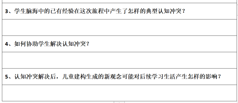 (2)确定学习目标,设计课前挑战单基于对儿童认知水平的了解,我们拟定学习目标,设计课前挑战单。学习目标和挑战单的拟定,我们以大观念为核心,以“大任务”“大项目”等为驱动,以核心知识与技能为着力点,从学科核心素养出发,尝试带领儿童一起穿越一趟课程之旅。(3)完成课前挑战单,评估儿童独立抵达的水平在每一个具体的课时段开启之前,儿童要先独立完成课前挑战单,这对儿童来说,是一场未知的旅行,儿童独自穿越,面对重重困难,尝试给出自己的解决路径。教师对儿童完成的课前挑战单进行诊断,尝试了解儿童脑海中应当被激活的观念是否已经被激活,儿童遭遇到了哪些认知困难,哪些是共性问题哪些是个性问题,如何设计最佳解决路径,儿童思维的发展空间何在,等等。我们尝试以填表的方式较为清晰地呈现在这趟穿越旅程中,儿童遭遇的困难,并设想解决之法。之后,对于即将开启的课堂对话进行新的设计与调整。