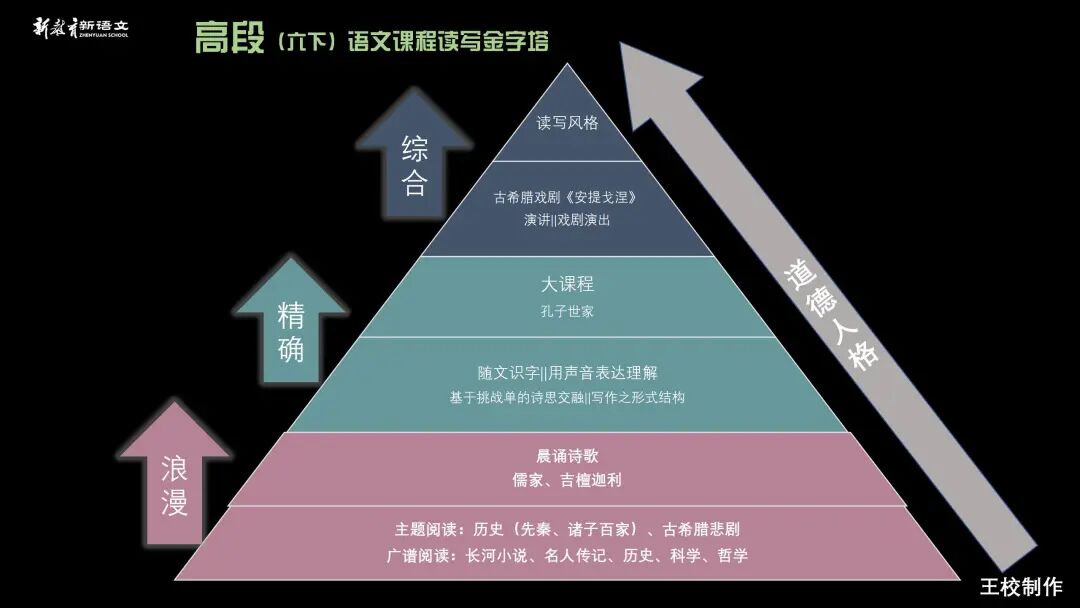 大家请看,这是高段(六下)语文课程读写金字塔,《孔子世家》课程处于金字塔的精确偏综合阶段。