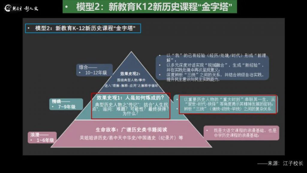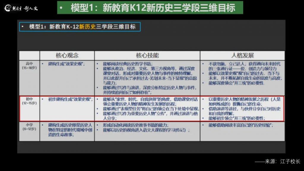 新教育K12 新历史三阶段三维目标,初中阶段:在核心观念的统绪下,锤炼核心技能,聚焦人格发展。以重要历史人物的精神发展历程,提撕自己的生命,借助演讲等途径与伙伴分享自己对历史与自我的理解,体会人之为人的意义,初步领会开三统的必要性。