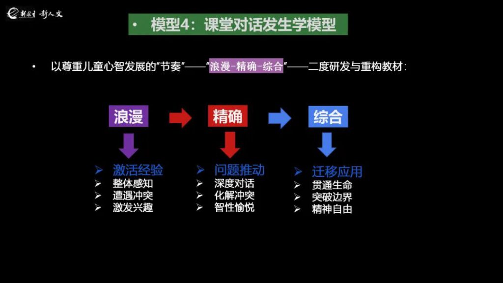我们以尊重儿童心智发展的节奏,用浪漫、精确、综合的方式,二度研发与重构教材,激活经验,问题推动、迁移应用。