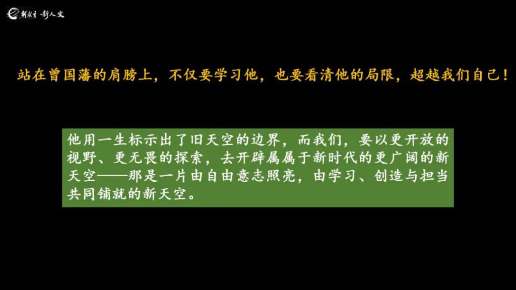 所以当我们学完曾国藩的故事,站在他的肩膀上,不仅要学习他的精神,也要超越他的局限,更要超越我们自己。他用一生标示出了旧天空的边界,而我们,要以更开放的视野、更无畏的探索,去开辟属于新时代的更广阔的新天空—那是一片由自由意志照亮,由学习、创造与担当共同铺就的新天空!
